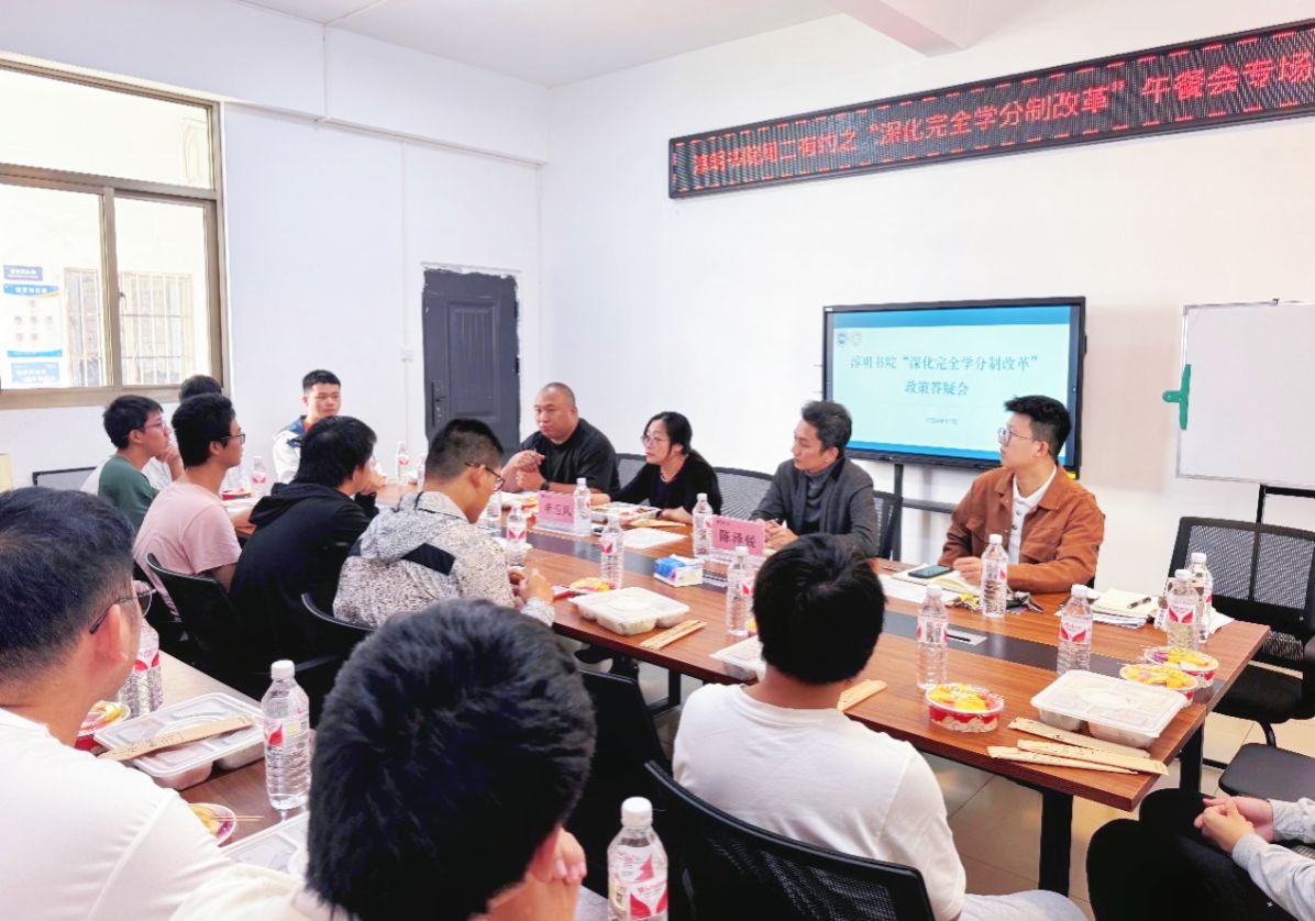 许修斌就淳明书院同学咨询集中的改革后学分认定、辅修专业和评优评先等相关问题,进行了指导咨询。两位老师还针对学生代表现场提问进行了逐一解答。