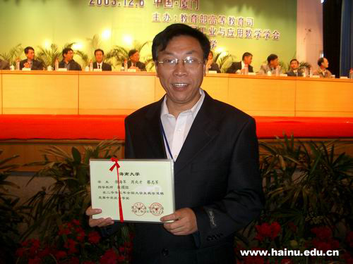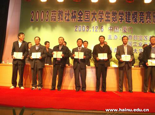 2003年全国大学生数学建模竞赛颁奖仪式于12月6日在厦门大学隆重举行。中国高教学会会长、前教育部部长周远清同志以及教育部高教司的有关领导,中国工业与应用数学学会理事长、全国大学生数学建模竞赛组委会主任、中国科学院院士李大潜教授,厦门市、厦门大学主要领导和全国部分省市的教育厅领导出席了大会。我校魏应彬副处长和洪世煌教授出席了大会,洪世煌教授代表海南省接受了大会的颁奖。