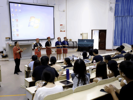 随后,传承人们展示了黎族山栏酒与祝酒歌。在传承人的带领下,同学们一同品尝山栏酒,共唱祝酒歌,欢快的旋律与热烈的氛围为课程画上圆满句号。