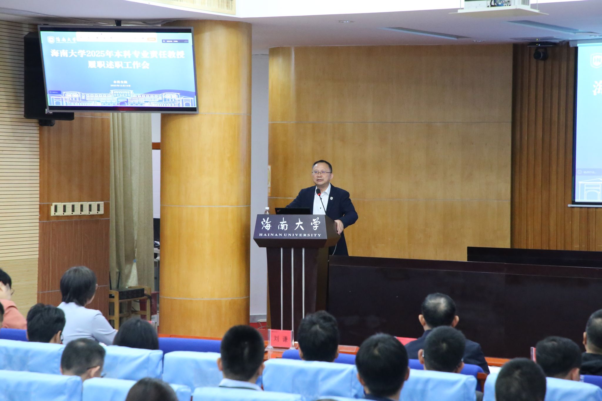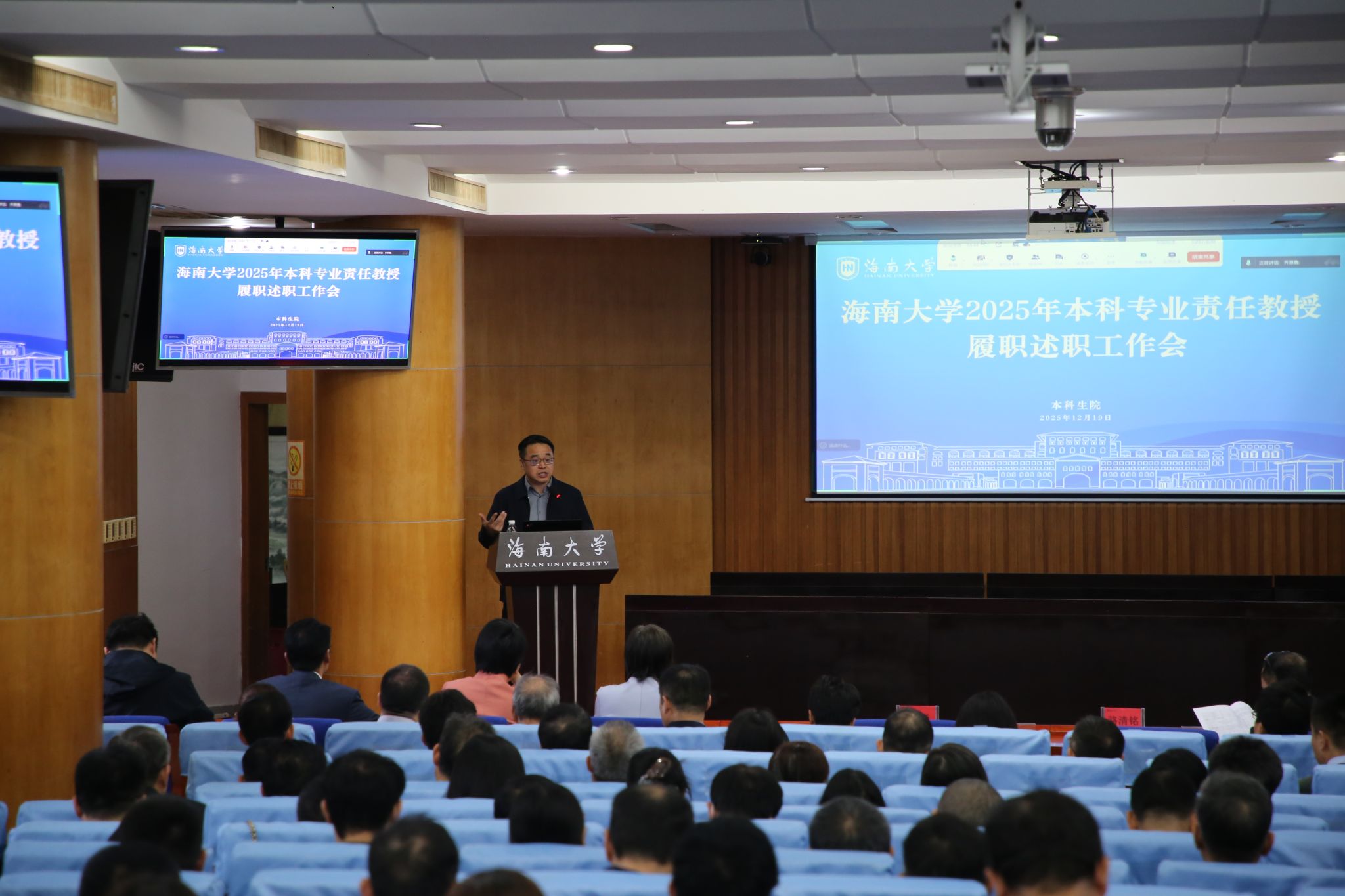 12月19日上午,海南大学在行政楼一楼召开2025年本科专业责任教授履职述职工作会。中国科学院院士、校长骆清铭出席会议并讲话。党委常委、副校长刘谦,党委常委、副校长李步洪,党委常委、组织部部长杨志昕,人事处、学工部、发规处、本科生院、研究生院、科发院、人文社科处、财务处、国际处、实验室与设备管理处相关负责人,学校本科教学指导委员会成员、本科教学督导委员会成员、全体本科专业责任教授,各学院书记或院长、教学副院长,书院书记代表等共计140余人参会。会议由党委常委、副校长刘谦主持。