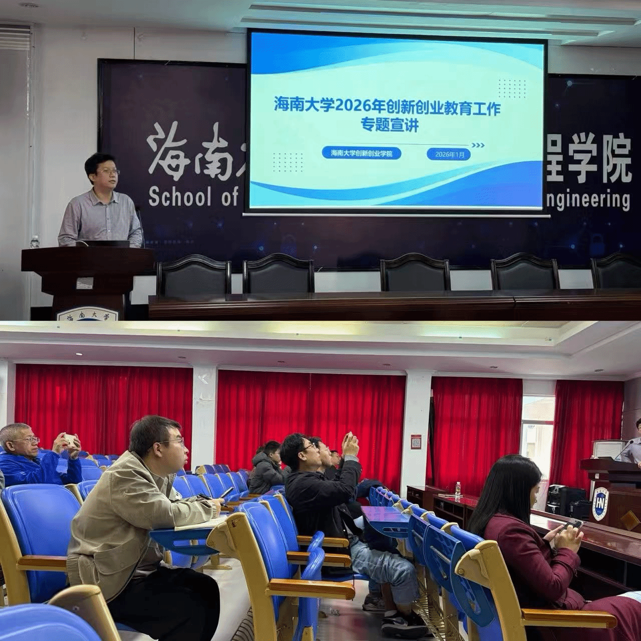 宣讲会围绕学校创新创业教育重点任务,系统解读了学校激励政策、中国国际大学生创新大赛最新动态以及海南大学创新创业学院十年发展历程三个方面内容。在学校激励政策方面,重点介绍了《海南大学高水平学科竞赛激励办法》,详细说明了竞赛成果在学生保研、学分认定以及教师职称评聘和岗位晋升中的具体支持措施。针对中国国际大学生创新大赛,宣讲会简要回顾了赛事发展历程与国家重视程度,并结合大赛主题,对赛事组织、参赛条件、赛制安排等关键环节进行了说明。在回顾创新创业学院十年发展时,重点分享了学院在深化创新创业教育改革中构建的“三位一体”实践平台体系,以及“抓团队、重实践、造氛围”的工作路径。