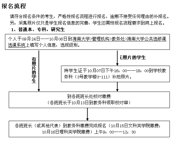 3、高职高专学生可报考A级(凡已取得A级考试合格证书者,不得再报名参加考试)。 4、根据规定要求,我校一律不接受社会考生报考。 二、报名时间:2008年09月24日——2008年10月06日 三、报名流程 请符合报名条件的考生,严格按报名流程进行报名,逾期不接受任何理由的补报名。