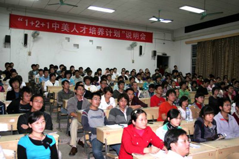 2009年1月5日晚上,儋州校区在电教课室召开了《1+2+1中美人才培养计划》项目说明会。教育部中教国际教育交流中心中美高校合作交流办公室首席总监华建宁和副总监王素媛为我校区08级近200名本科生、研究生及教务处、研究生处和学生工作处等相关部门的工作人员作了“1+2+1中美人才培养计划”项目说明会。教务处处长程立生教授主持说明会。 说明会上,华建宁总监以图文并茂的方式,就“1+2+1中美人才培养计划”项目的内容、合作院校的情况以及中方留学生在美国的学习和生活状况等方面向同学们作了详细的介绍,会后部分同学就此顶目向华总监和王副总监进行了咨询。 “1+2+1中美人才培养计划”是(教育部)中国教育国际交流协会(CEAIE)、中教国际教育交流中心(CCIEE)和美国州立大学与学院协会(AASCU)共同合作与管理的新型中美高等教育双向交流与合作项目,它为我校在校大学生提供了免试出国留学的机会,也为我校提高教学质量及国际化水平,培养复合型、创新型人才提供了一个良好的平台。 说明会在同学中引起了较大的反响并受到了08级学生的关注。