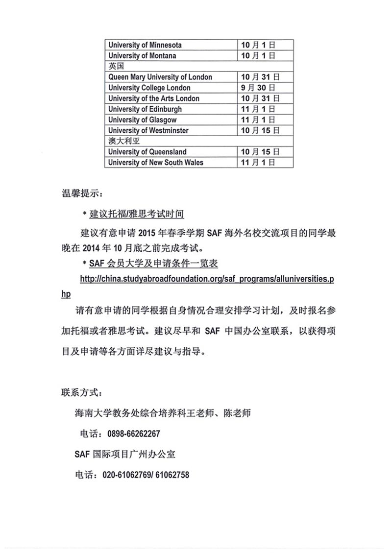 关于我校“SAF海外名校交流项目” 2015年春季入学报名的通知