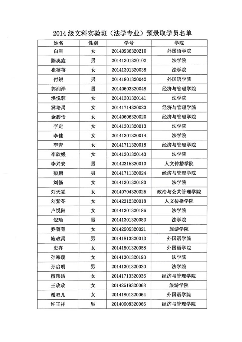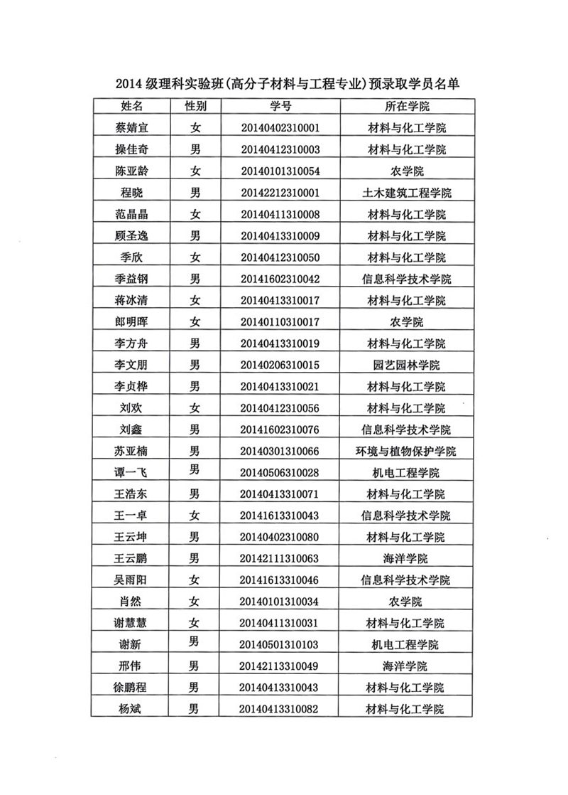 2014级理科实验班(高分子材料与工程专业)预录取学员名单