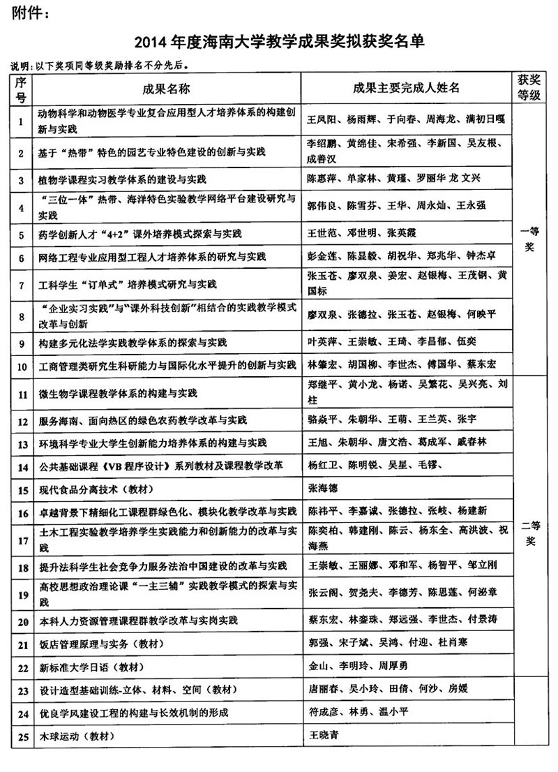 附件:2014年度海南大学教学成果奖拟获奖名单