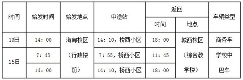 (2)15日至22日按照《关于期末考试间调整海甸与城西校区通勤车部分发车时间的通知》(具体内容见附件)的时间、地点乘车。