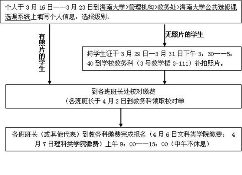 (1)在网站下载EXCEL报名表格,以学院单位报名,将EXCEL表格打印,由学院核实学生的在籍资格,报名表签字盖章后连同EXCEL电子文档一起于3月23日下午交教务科。 (2) 各学院3月29日到教务科领取校对单,根据校对单通知没有照片的同学3月31——4月1日下午3:30——5:40持学生证和身份证到学校教务科(3号教学楼3-111)采集照片。 (3)各学院根据校对单收取信息正确学生的报名费于4月8日到教务科交费完成报名。 三、收费标准