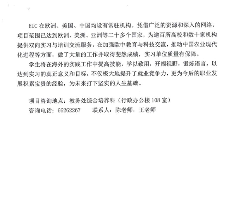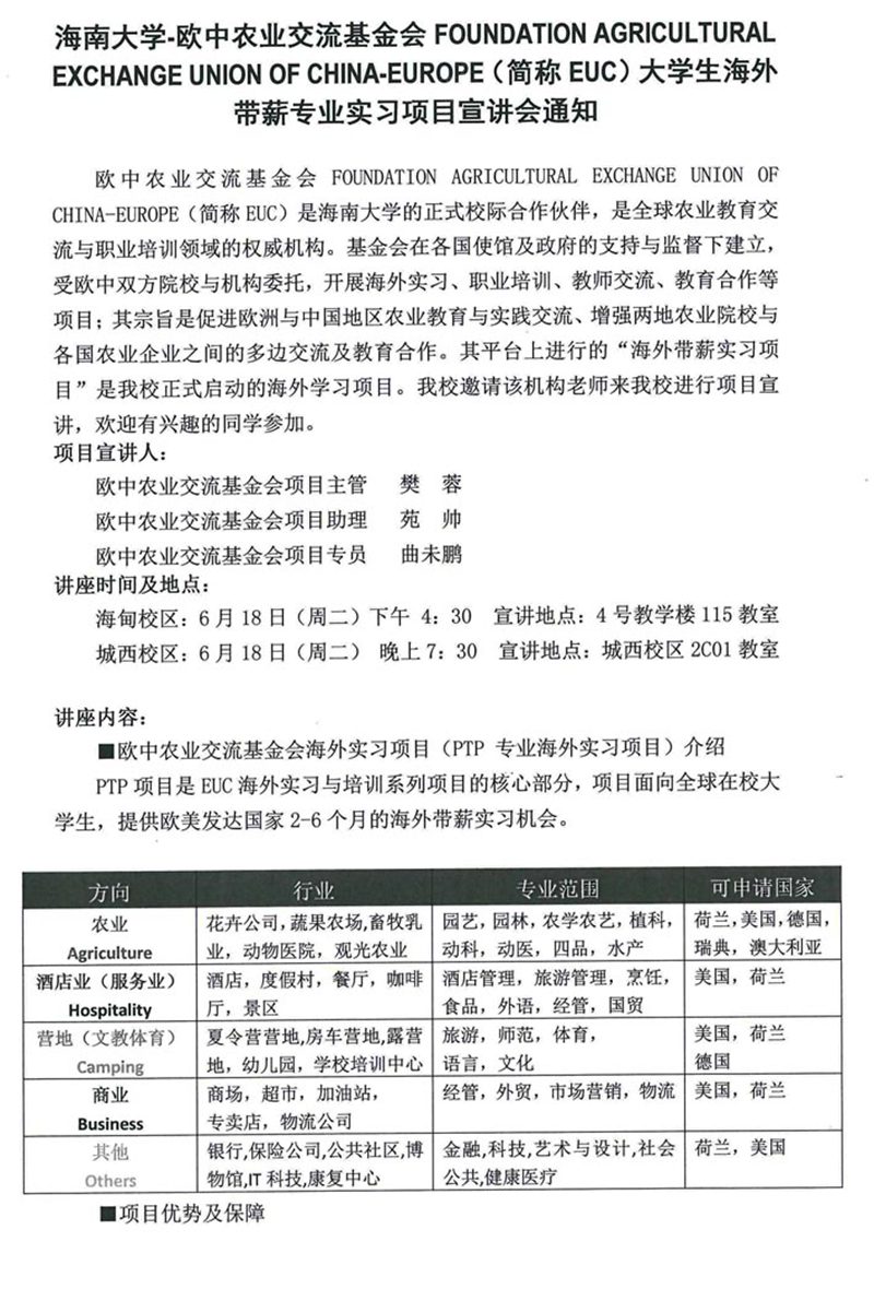 海南大学-欧中农业交流基金会FOUNDATION AGRICULTURAL EXCHANGE UNION OF CHINA-EUROPE(简称EUC)大学生海外带薪专业实习项目宣讲会通知