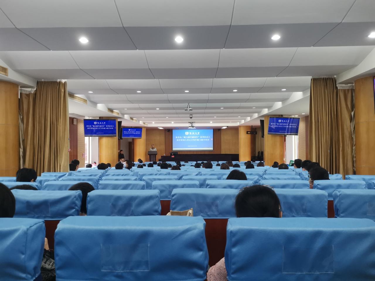 2022年5月17日下午3时,教务处在办公楼一楼报告厅召开“能力提升建设年”系列活动之教学管理人员公文写作能力提升培训会,参加培训会的有教务处全体工作人员、信息化服务中心全体工作人员、各二级学院教学院长及全体教学秘书等110多人参加培训,培训会由教务处副处长谢辉凡主持。