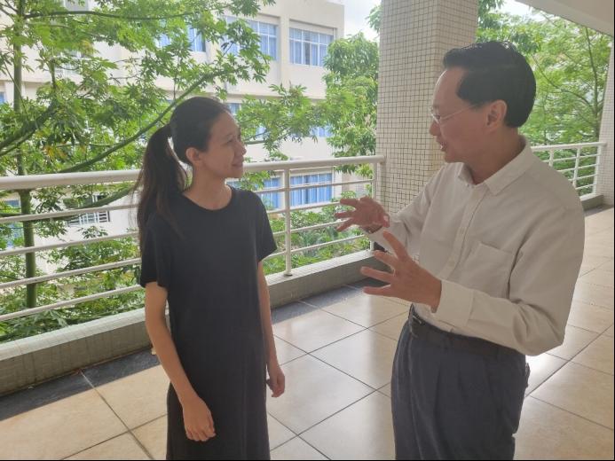 听课结束,符宣国与任课老师进行交流反馈。他肯定任课教师的教学态度和教学质量,认为课程准备充分,深入浅出,思路清晰。同时也指出教学过程中老师和学生存在的问题。