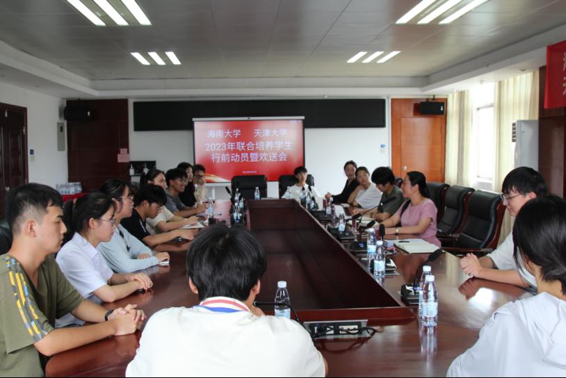 2023年6月9日下午,海南大学与天津大学2023年联合培养学生行前动员暨欢送会在办公楼401会议室召开,教务处谢辉凡副处长、学生工作部(处)王萌萌科长、教务处陈黎明科长、项目负责人齐恩鲁老师及全体项目学生参加会议,会议由教务处综合培养科陈黎明科长主持。