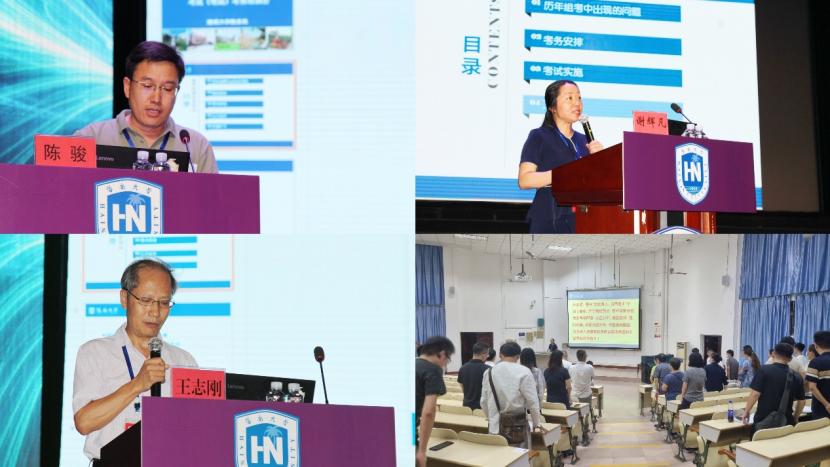 图二 副校长陈骏和教务处处长王志刚等领导在监考人员培训会上做重要讲话/监考人员进行宣誓环节