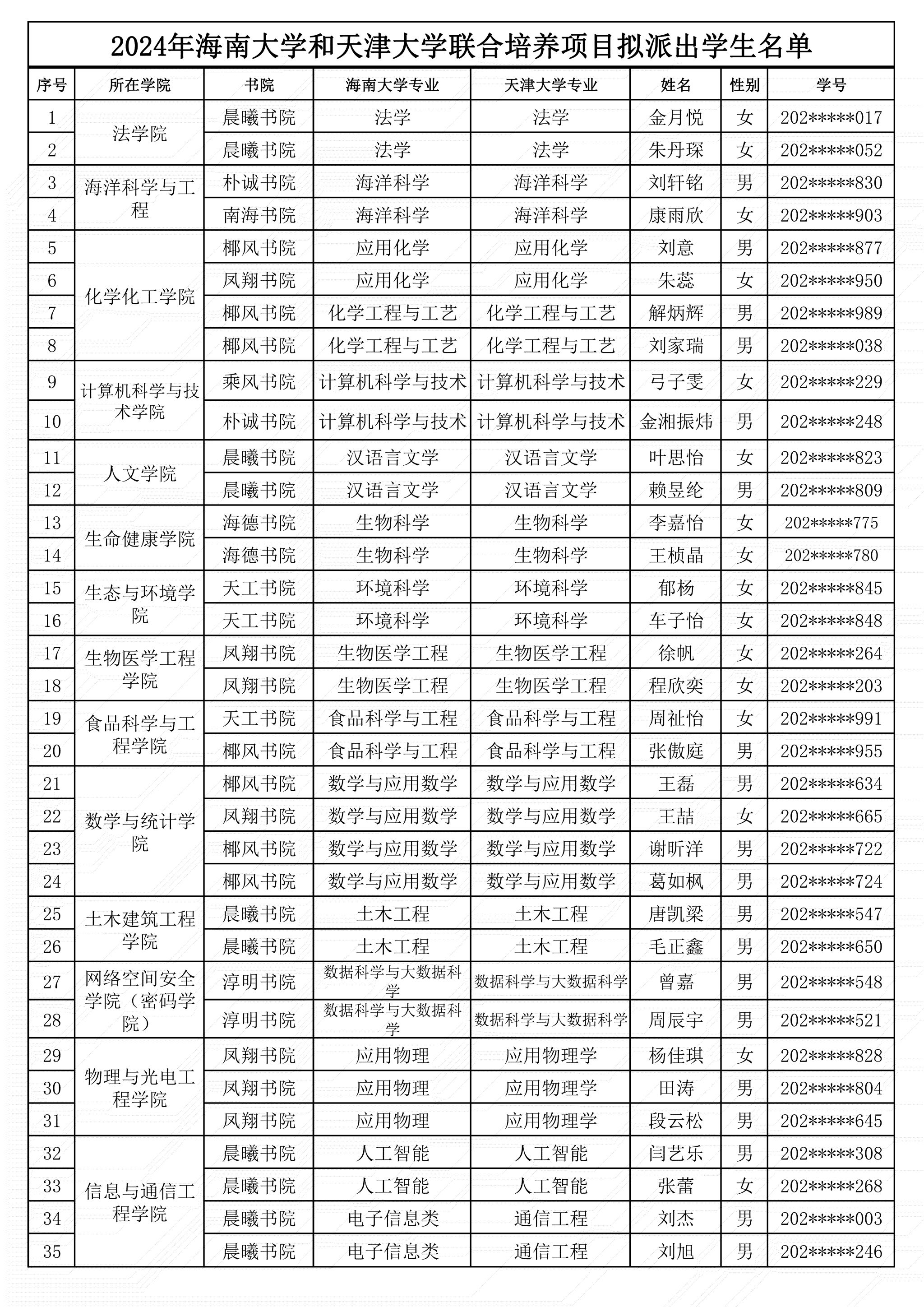 关于2024年海南大学和天津大学联合培养项目拟派出学生名单公示