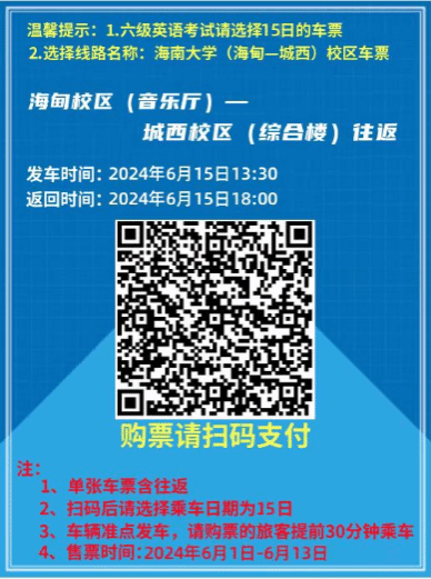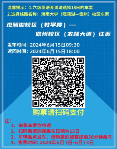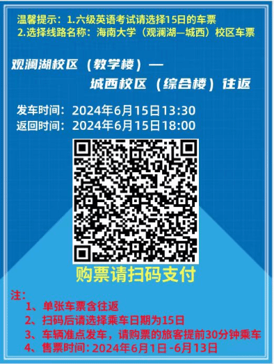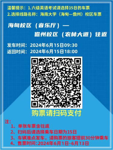 为解决跨校区考生交通问题,学校与海汽公司商议后提供以下方案,需要乘车的考生按需自愿购票(请于6月13日前购票),并在规定时间、地点乘车,届时海汽公司将根据购票情况派出车辆。