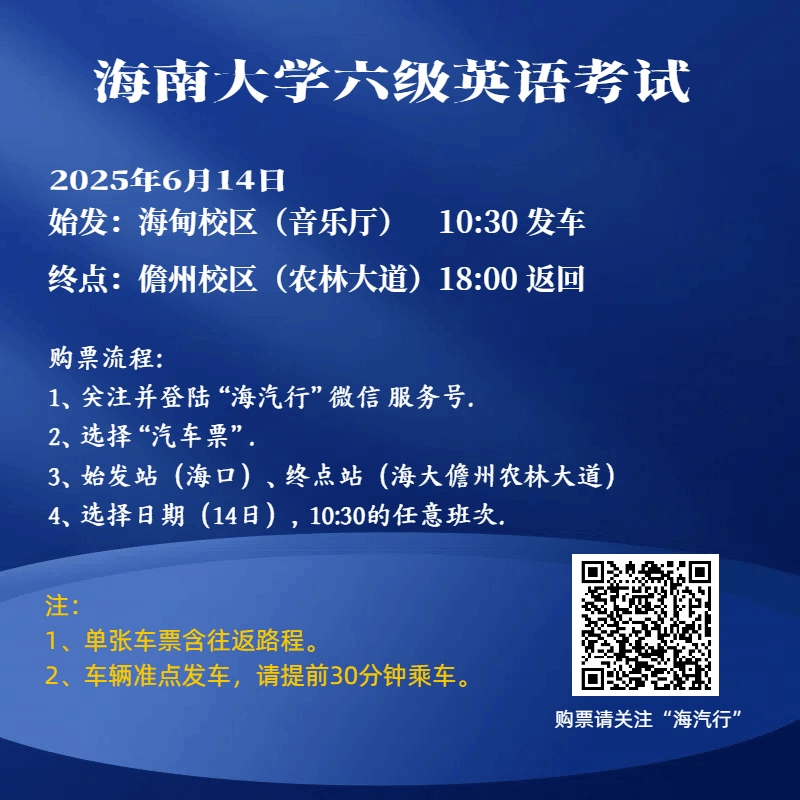 为解决跨校区考生交通问题,学校与海汽公司商议后提供以下方案,需要乘车的考生按需自愿购票(售票时间6月5日-6月13日),并在规定时间、地点乘车,届时海汽公司将根据购票情况派出车辆。