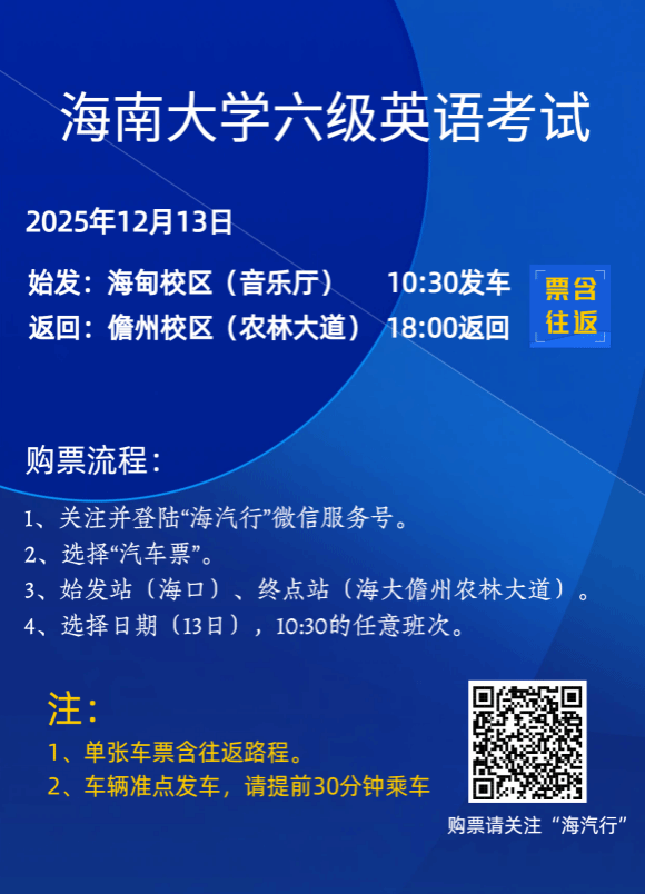 为解决跨校区考生交通问题,学校与海汽公司商议后提供以下方案,需要乘车的考生按需自愿购票(售票时间12月4日-12月11日),并在规定时间、地点乘车,届时海汽公司将根据购票情况派出车辆。