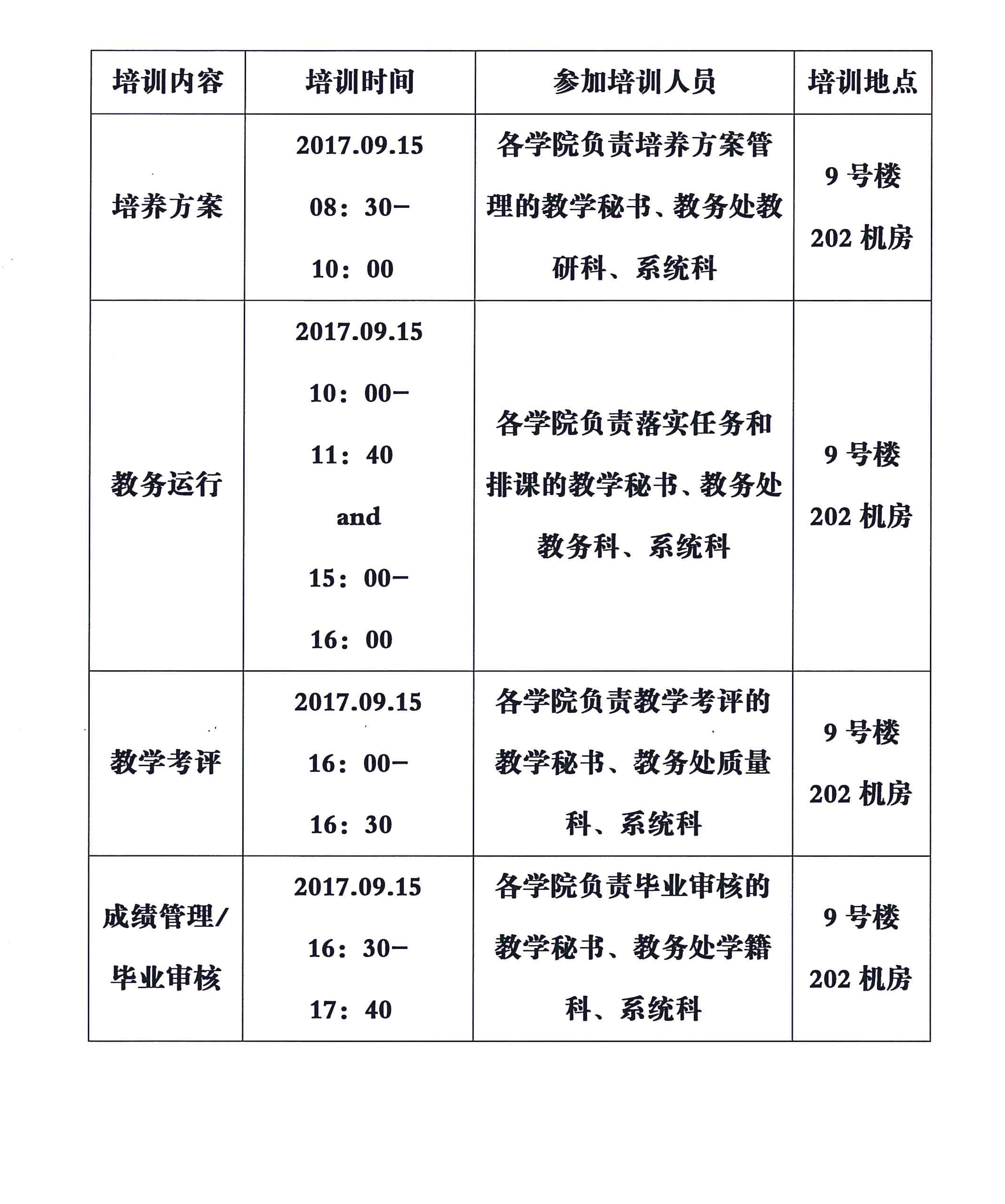 强大的教务管理信息系统是确保全校本科正常教育教学之关键,是保障学校各项改革顺利推进的基石,是学校众多基础工作的至关重要的一环。随着学校各项教育教学改革的深入,现有的正方教务管理系统由于系统结构老化,售后服务跟不上等原因,导致系统长期存在安全、功能缺失、错误等问题。2017年8月,我校引进了新的教务管理信息系统。为了使新旧系统实现平稳、安全过渡,现就新教务管理系统培训等有关事项通知如下: