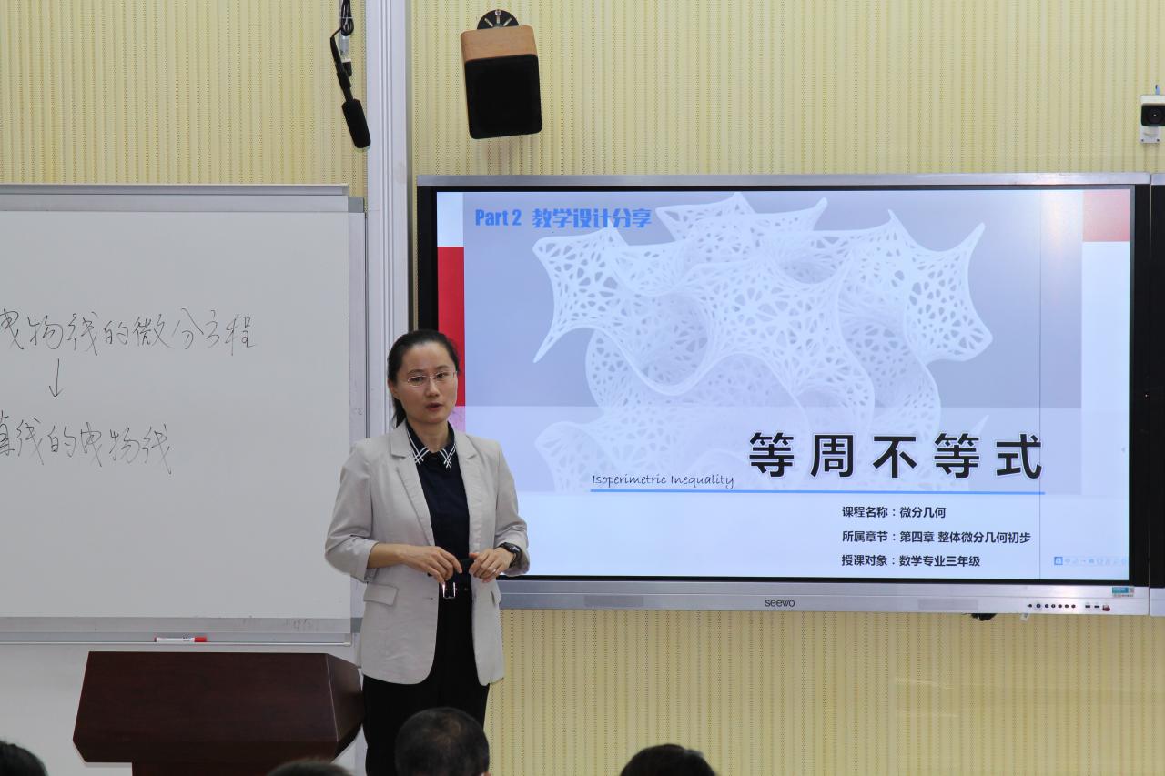 2023年3月23日,教学团队成员之一——第五届全国高校青年教师教学竞赛理科组第一名获得者刘白羽教授在5-111教室主讲了一堂《微分几何》示范课,并和大家分享了基于学生特质的有效教学方法。并与现场的我校教师进行了深入的交流和互动。