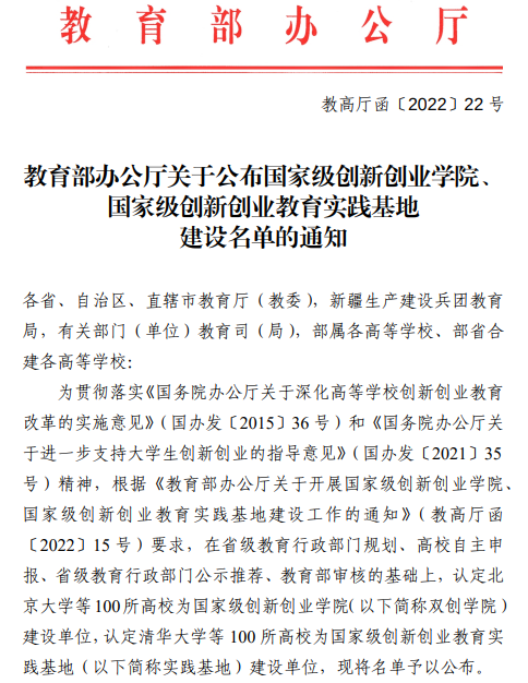 近日,教育部办公厅发布了《关于公布国家级创新创业学院、国家级创新创业教育实践基地建设名单的通知》(教高厅函〔2022〕22号),海南大学被认定为国家级创新创业学院建设单位。