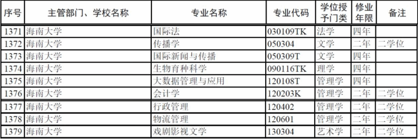 近日,教育部公布2023年度普通高等学校本科专业备案和审批结果,海南大学获批增设四个本科专业,分别为国际法、国际新闻与传播、生物育种科学、大数据管理与应用,同时还获批备案五个第二学位专业。此次增设专业是学校按照教育部等部门印发的《普通高等教育学科专业设置调整优化改革方案》有关要求,立足于服务海南自贸港建设和海南地方经济社会发展需要,结合学校实际而设。