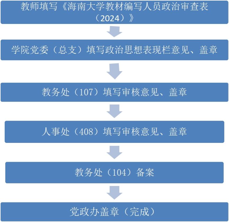 为便于老师们办理编写教材、申报项目等涉及的政审及用印事务,学校开通了“海南大学网上服务大厅线上申请线上盖印”及“海南大学网上服务大厅线上申请线下盖印”业务,涉及教务处的编写教材及申报项目需要政审的,将按照以下流程办理: